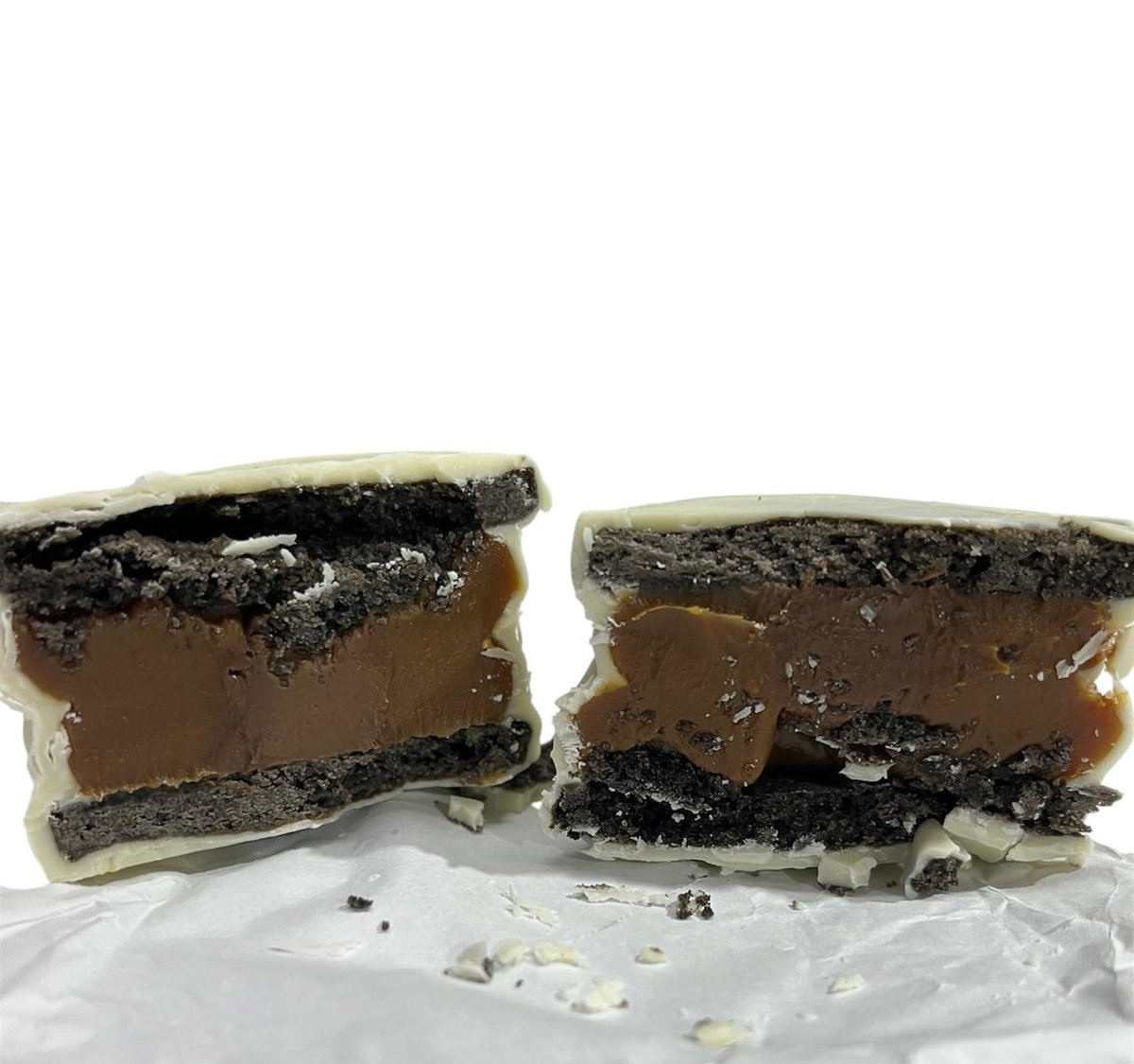 ALFAJOR BLANCO CHOCOBALE COBERTURA BLANCO TAPITAS DE CHOCOLATE RELLENO: DULCE DE LECHE Y PASTA DE AVELLANAS