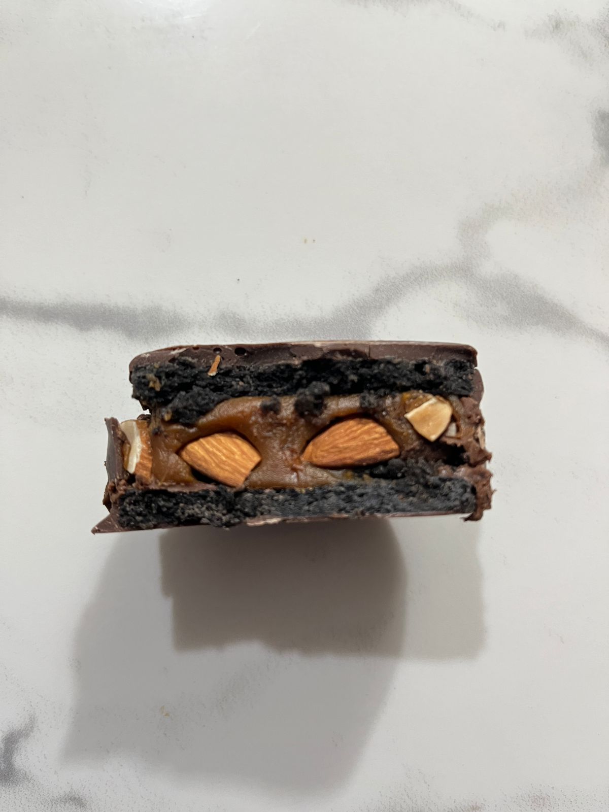 TAPITAS DE CHOCOLACOBERTURA DE CHOCOLATE CON LECHE RELLENO DE DULCE DE LECHE + TROZOS DE ALMENDRAS TOSTADAS + PASTA DE AVELLANAS
